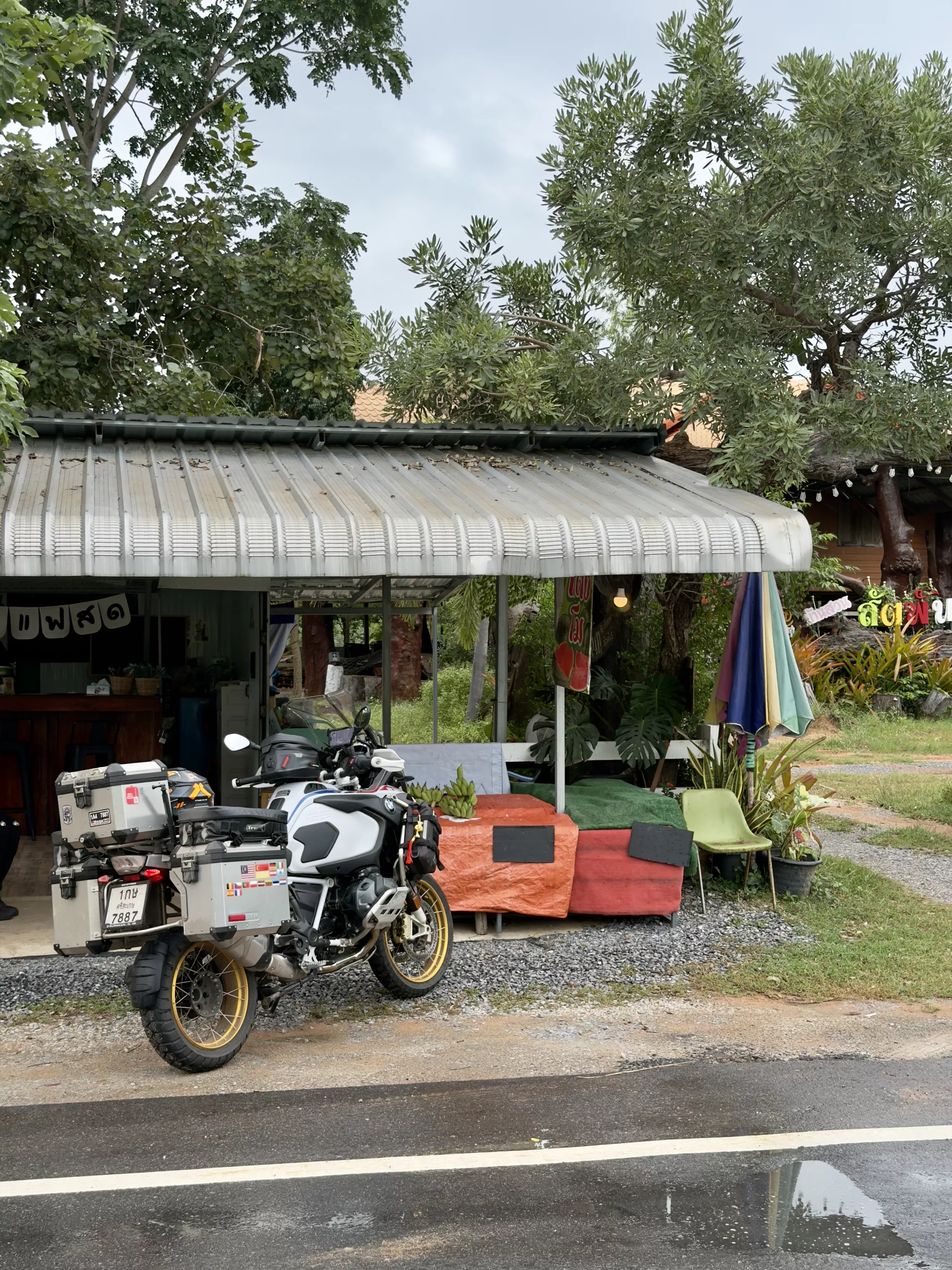 At first, it was just a few drops on the visor, but soon it was coming down like someone had tipped a bathtub from the clouds. By the time we reached Chum Phae, everything was soaked except our sense of humour. We spotted a resort along Highway 201 — 400 baht a night. You beauty! Clean room, a roof for the bike, and even a half-decent mattress.